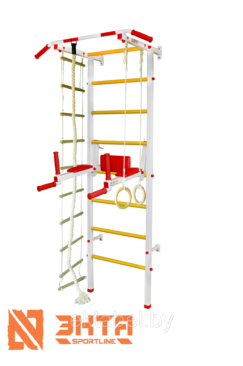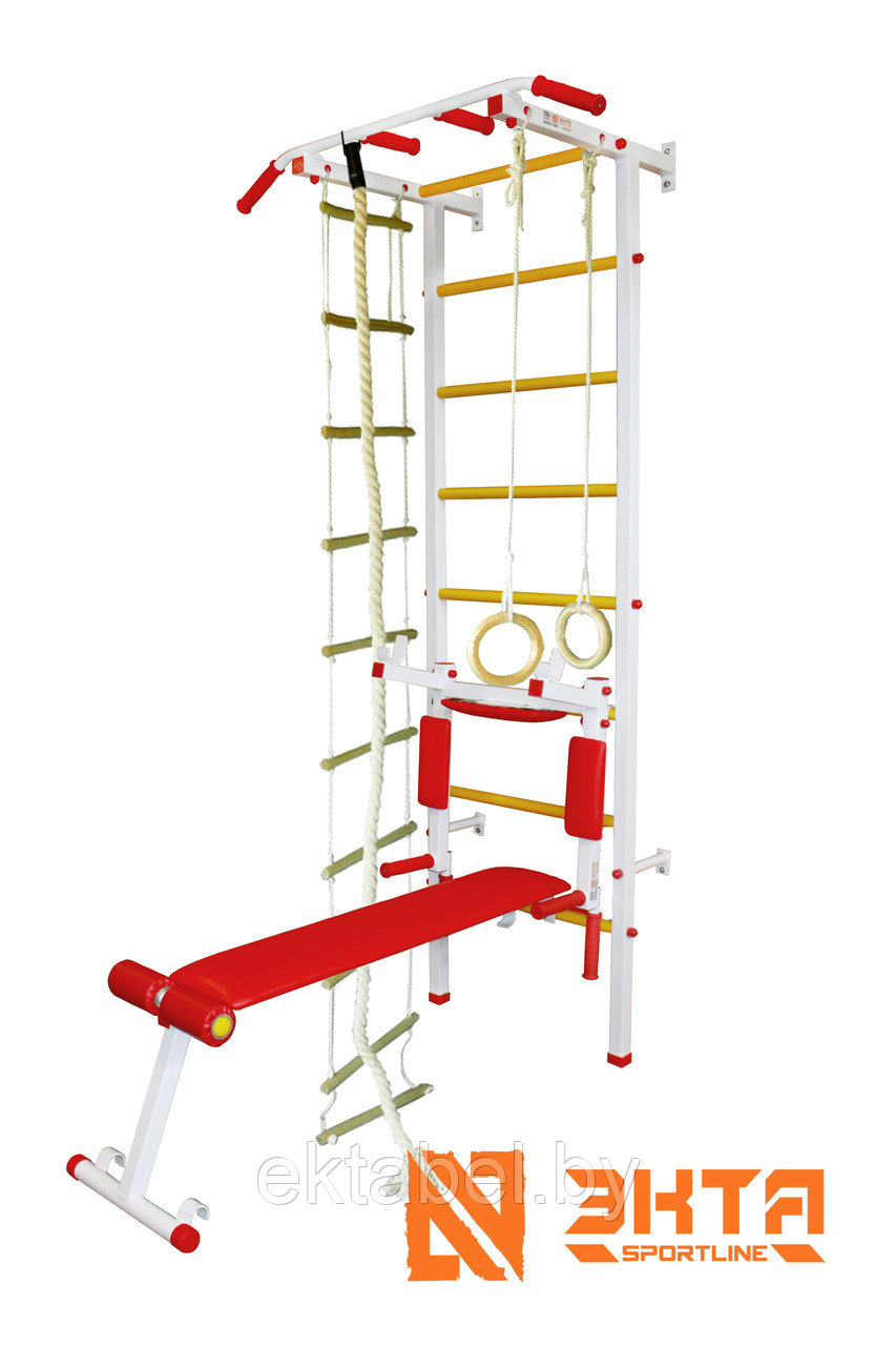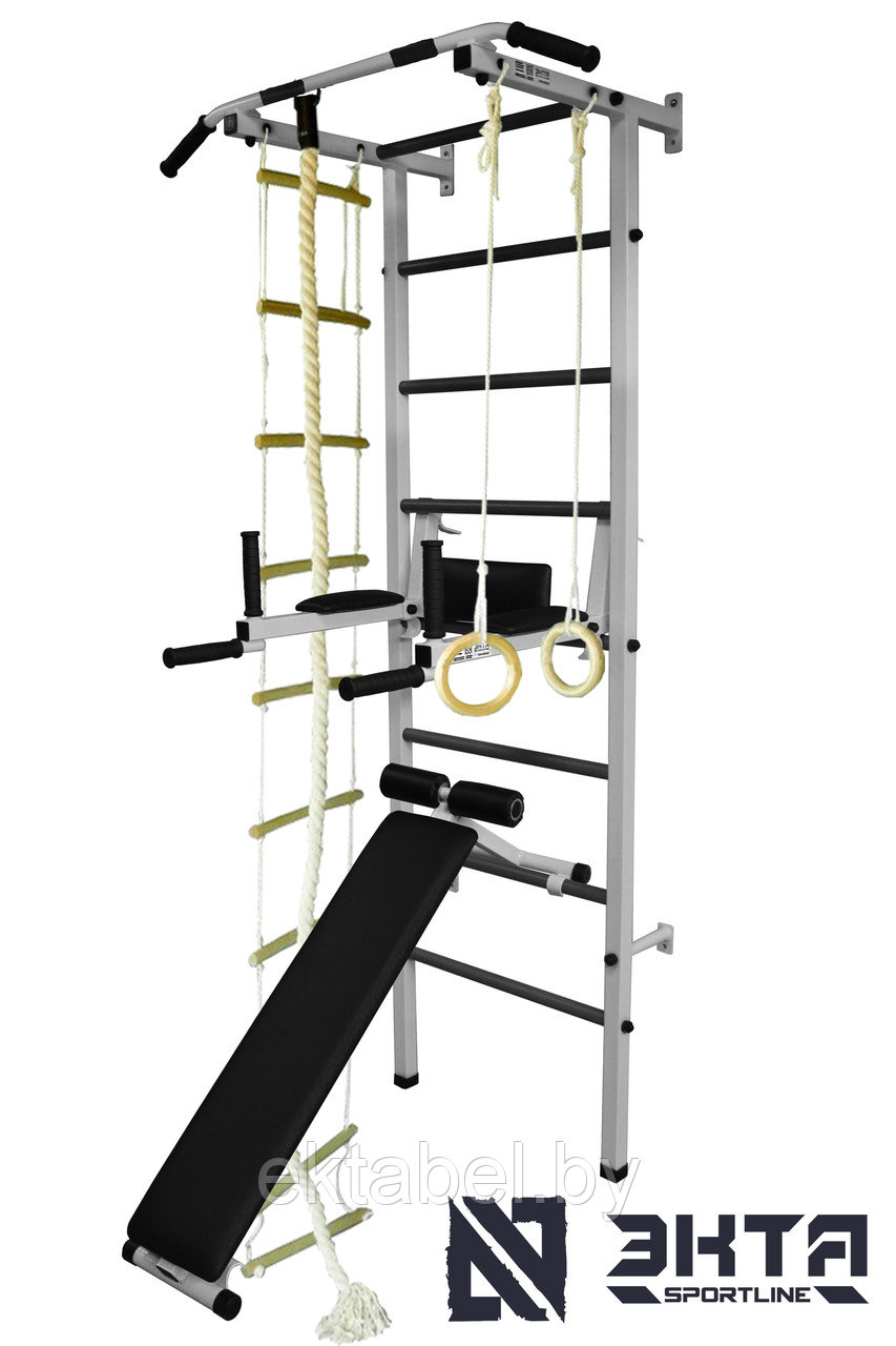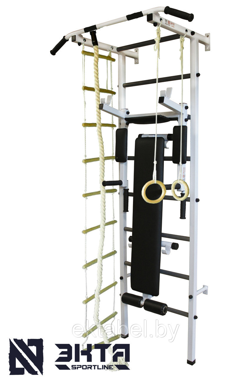В комплект входит: Лестница, брусья, скамья, турник, канат для лазанья, кольца гимнастические, лестниц веревочная.
